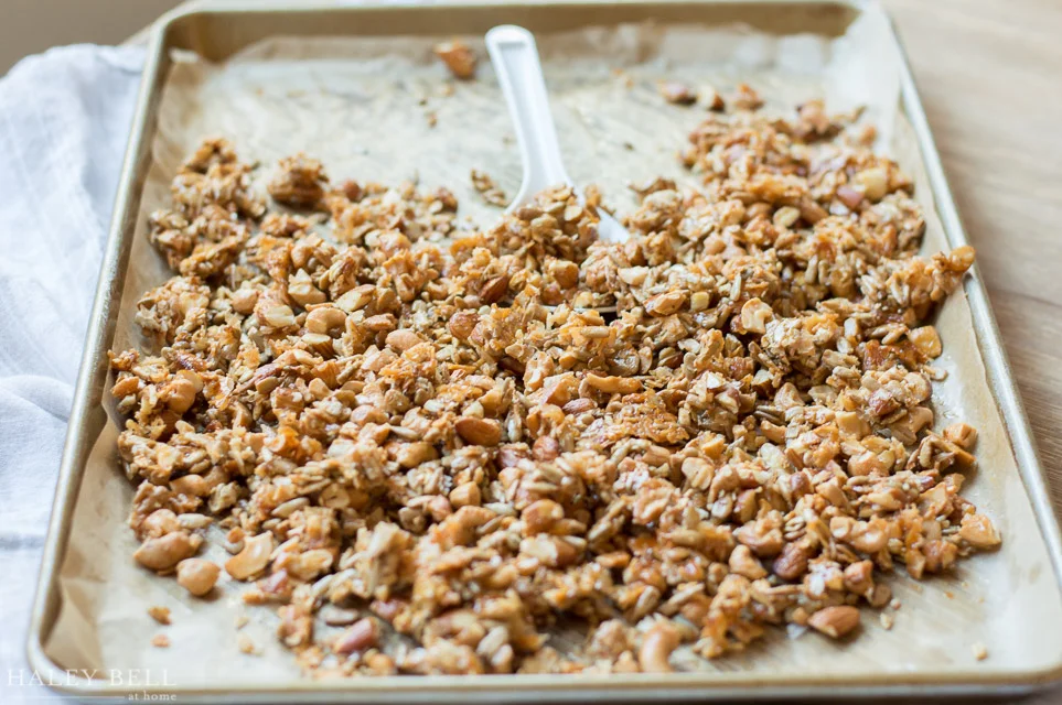 - Preheat oven to 300 degrees F. Line a baking sheet with parchment paper. Roughly chop the cashews and almonds. In a bowl, combine the cashews, almonds, sunflower seeds and coconut flakes.