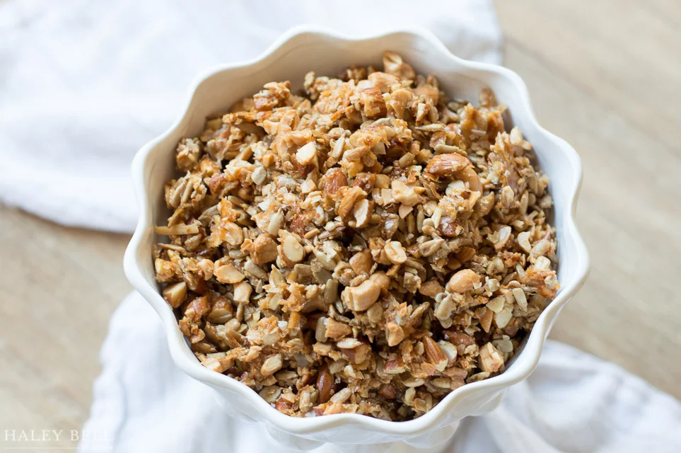 - In a large microwave-safe bowl, melt the coconut oil, vanilla, and honey together for 40-50 seconds. Add to the nut mixture, and stir to coat.