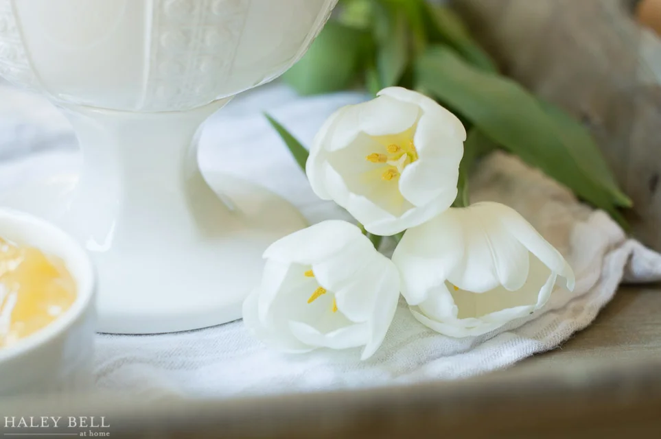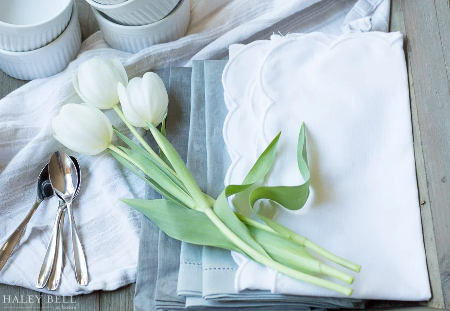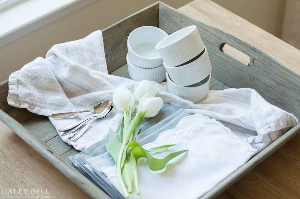 To create this look, I used my set of these beautiful wooden trays to put everything on. I then layered the tray with simple linens and all of the white dishes and serving spoons. These wooden trays and linens are also a staple in our house. They make for very easy entertaining!