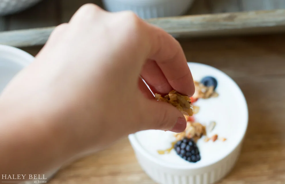 I started by making a big batch of my homemade granola (recipe below). I made this granola recipe with this exact yogurt bar in mind so I could control the sweetness against all the other components. It is a great recipe to serve to a crowd since it's gluten and dairy free and lightly sweetened. It's also incredibly amazing served on its own!