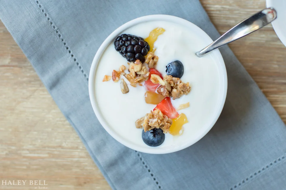 To make the Meyer lemon yogurt, I simply mixed regular plain yogurt with Meyer lemon curd. You can also just serve the plain yogurt and a dish of the Meyer lemon curd so guests can control their own sweetness. I absolutely love the flavor the lemon curd adds!